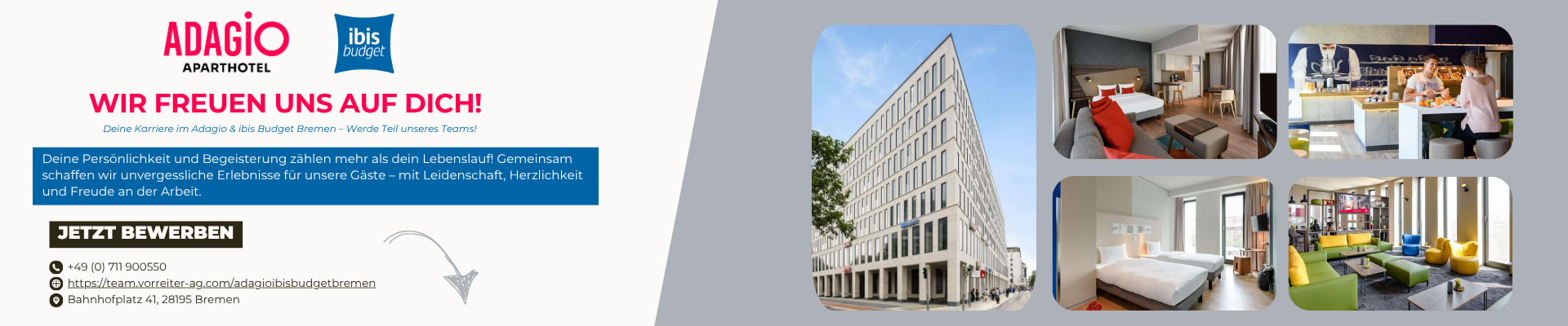 Dann freuen wir uns auf deine Bewerbung – und vielleicht führst du schon bald gemeinsam mit uns das Aparthotel Adagio & ibis Budget Bremen City Center in die Zukunft.